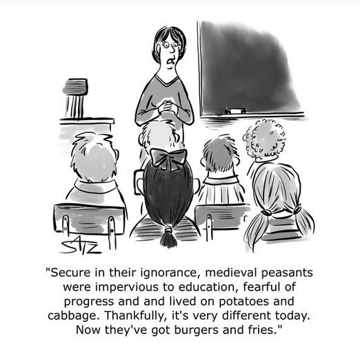 “Secure in their ignorance, medieval peasants were impervious to education, fearful of progress and lived on potatoes and cabbage. Thankfully, it’s very different today. Now they’ve got burgers and fries.”